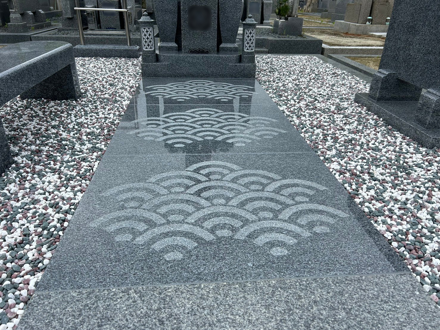 『堺市 添尾墓地』にて黒龍K12特級石のお墓が完成。地震対策『泰震』施工で地震対策もバッチリ。石製ベンチに広々とした大きな青海波模様の拝石。