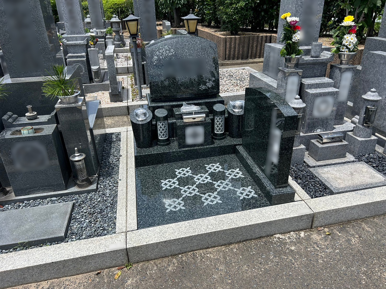 『泉大津公園墓地(板原墓地)』にて黒御影石M1-H石の洋型石碑が完成。地震対策『泰震』施工で地震対策もバッチリ。立体彫刻で煌びやかに。