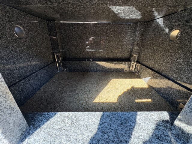 佐賀県産天山特級石(銀剛)デザイン墓石(納骨堂型)のお墓工事をさせていただきましたので、