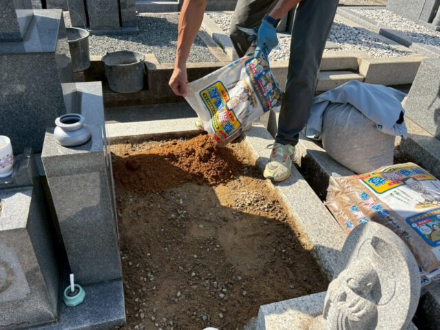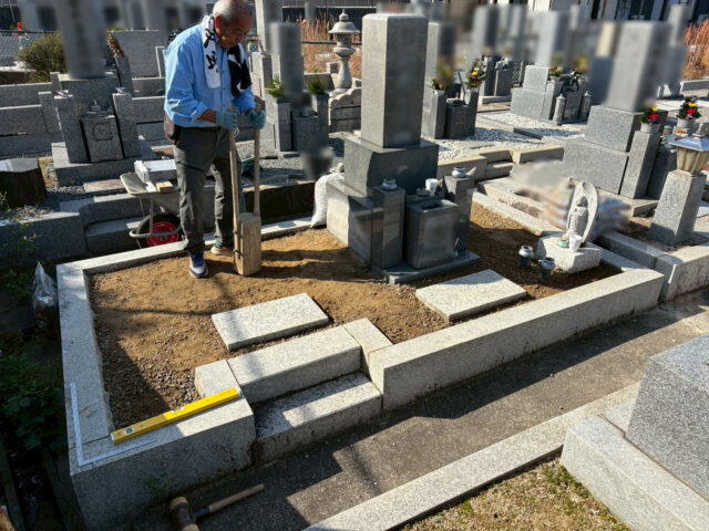 玉砂利・土をすき取り、霊標の地盤を転圧